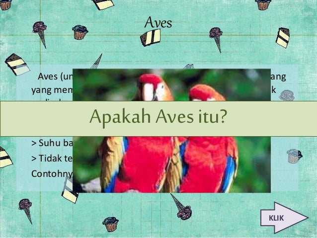 Aves merupakan anggota filum hewan vertebrata yang memiliki kekhususan Aves atau burung adalah satu satunya kelompok hewan yang memiliki bulu dan sayap Bulu pada aves berfungsi untuk melindungi tubuh dan terbang bagi sebagian aves Tulang tulang pada aves merupakan tulang berongga Hal inilah yang menjadikan aves bergerak lebih ringan