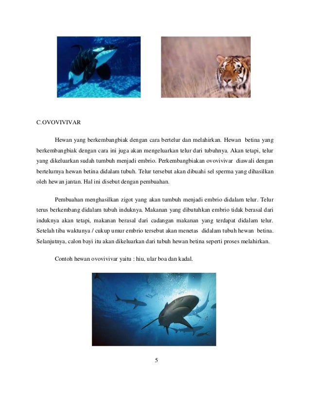 Nov 21 2021 Contoh hewan ovovivipar adalah hiu kadal ikan dan ular Ketika terjadi pembuahan pada tubuh betina maka terbentuklah telur Zigot yang tumbuh menjadi embrio terdapat pada telur tersebut proses ini disebut dengan kehamilan sesudah embrio tumbuh