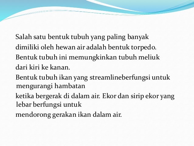 Salah satu bentuk tubuh yang paling banyak dimiliki oleh hewan air ialah berbentuk torpedo Dengan bentuk tubuh ini memungkinkan tubuh hewan yang berada di dalam air untuk meliuk liuk dari kiri ke kanan Bentuk tubuh ikan yang streamline memiliki fungsi sebagai pengurang hambatan saat bergerak di dalam air